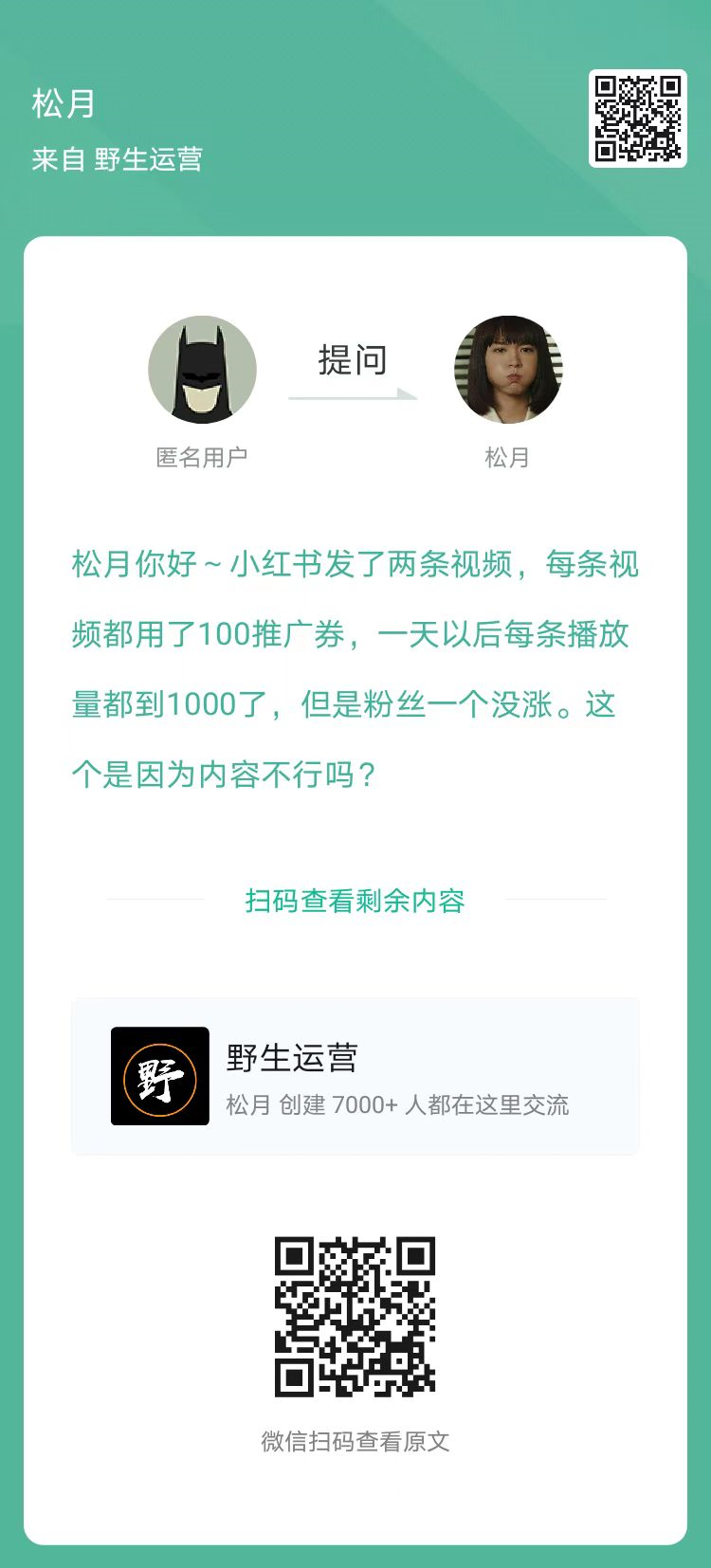 2、提问:目前在做小红书,每条视频700播放,赞和收藏加起来不到10个,是因为内容不行吗?(扫码查看全文)