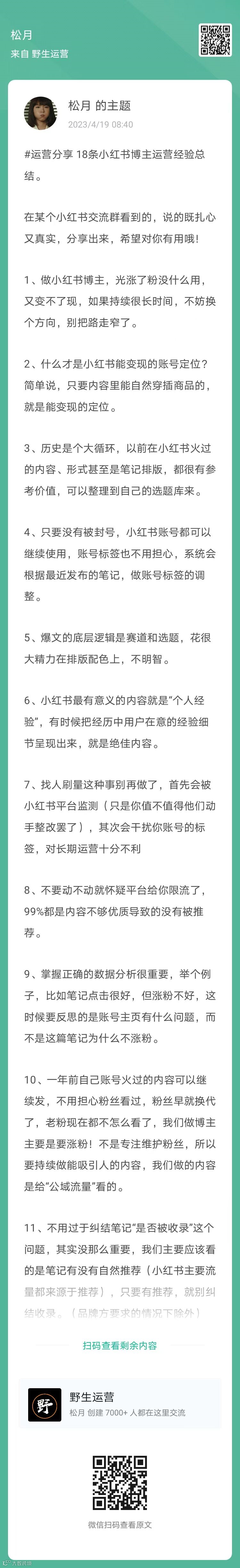 7、松月:18条小红书博主运营经验总结(扫码查看全文)