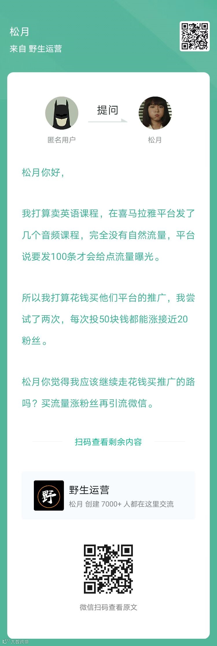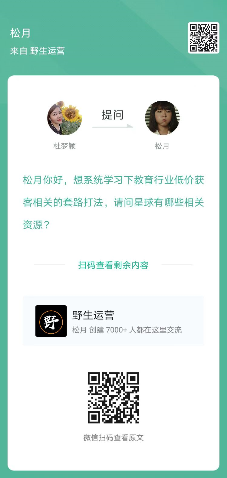 7、提问:想系统学习下教育行业低价获客相关的套路打法,请问星球有哪些相关资源?(扫码查看全文)