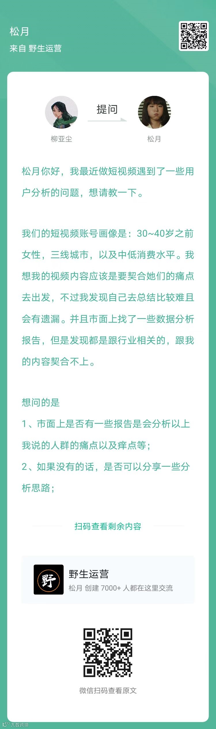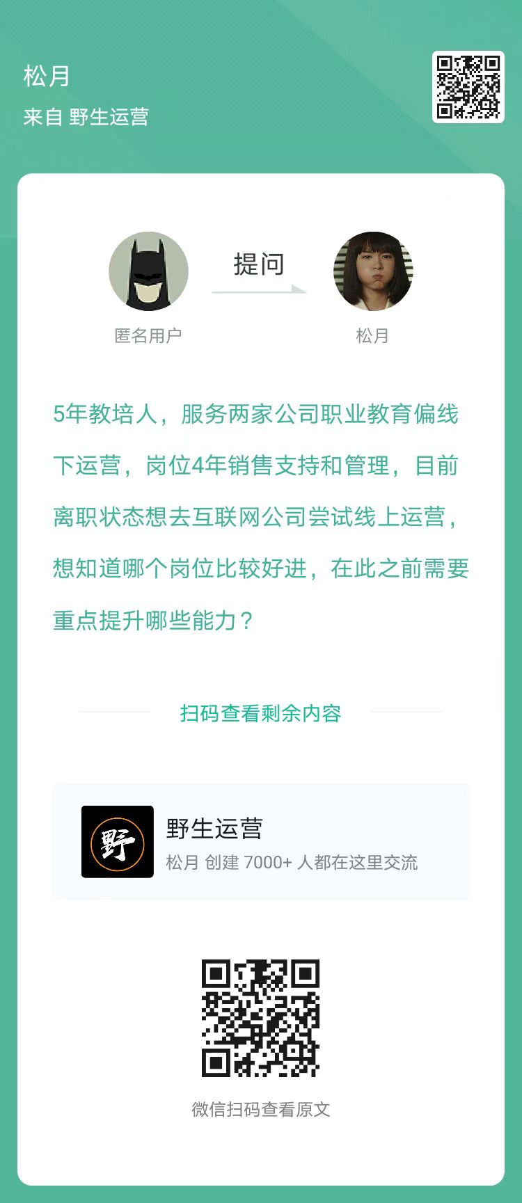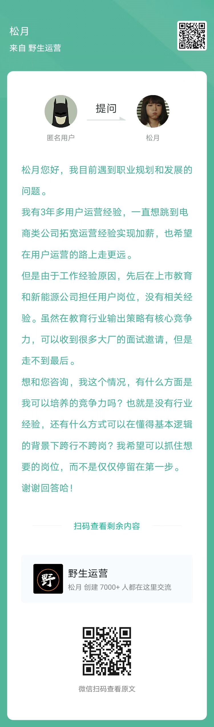 9、提问:想去互联网公司尝试线上运营,想知道哪个岗位比较好进,在此之前需要重点提升哪些能力?(扫码查看全文)