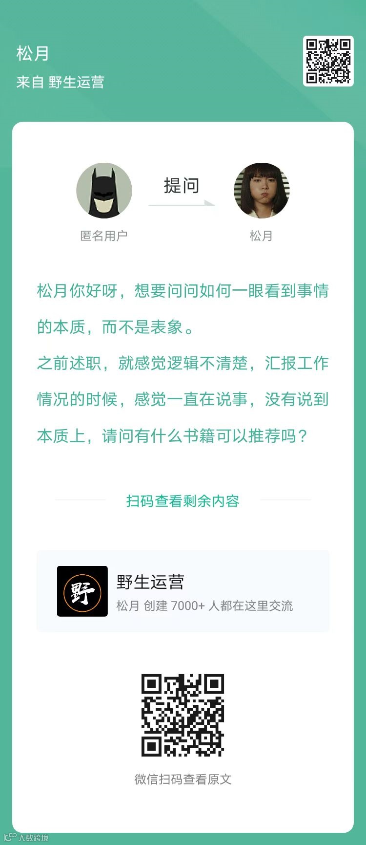 1、提问:没有行业经验,还有什么方式可以在懂得基本逻辑的背景下跨行不跨岗?(扫码查看全文)