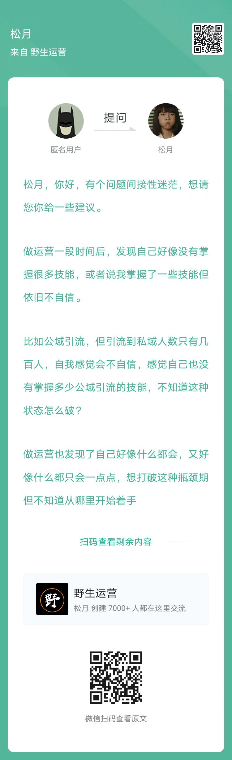 8、提问:做运营也发现了自己好像什么都会,又好像什么都只会一点点,想打破这种瓶颈期但不知道从哪里开始着手?(扫码查看全文)