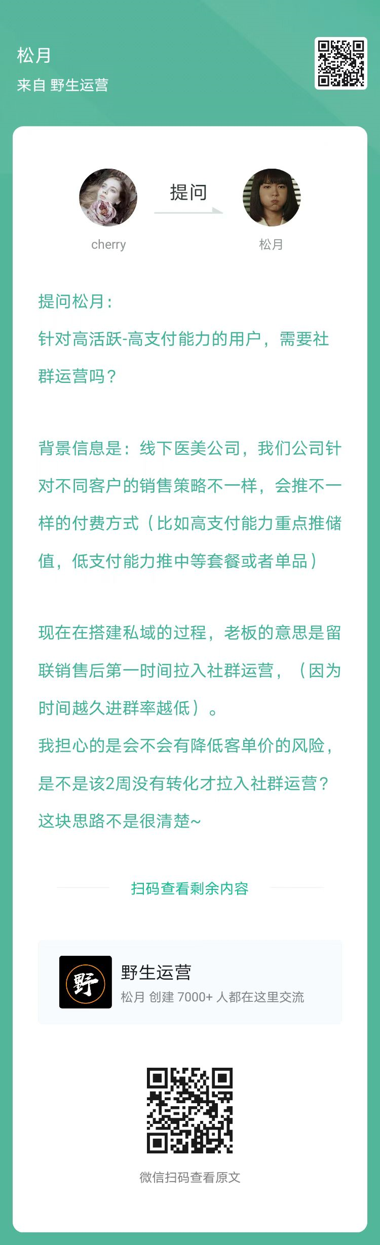 3、提问:医美公司,针对高活跃-高支付能力的用户,需要社群运营吗,及什么时候引入比较好?(扫码查看全文)