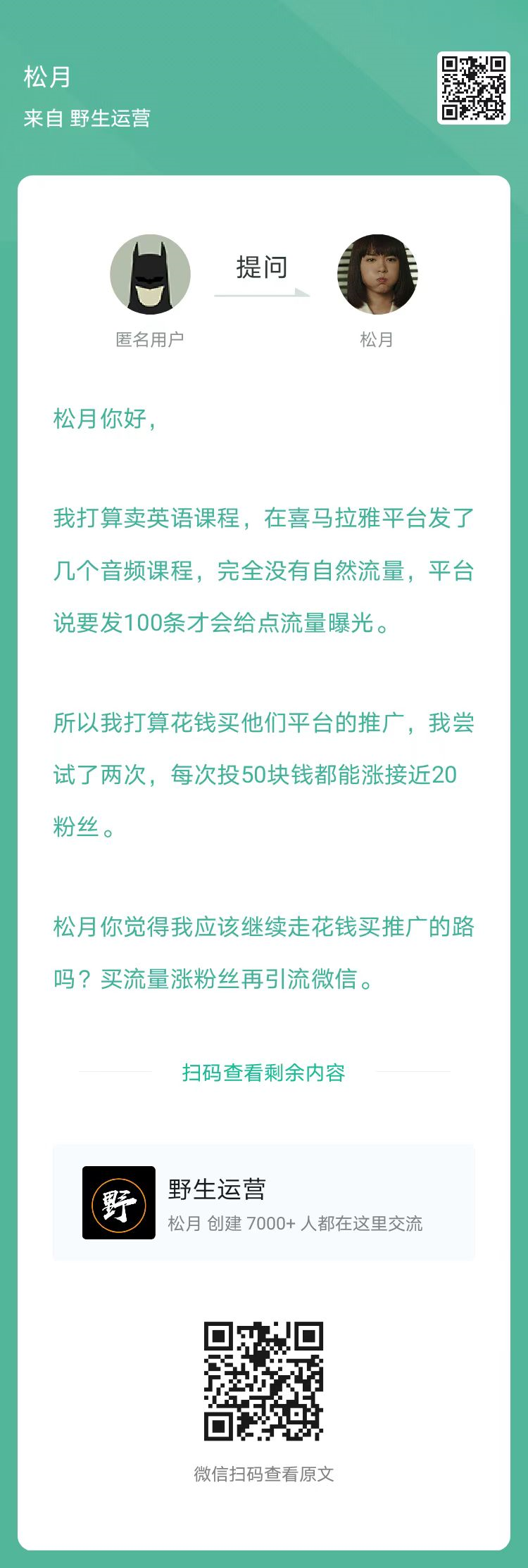6、提问:在喜马拉雅投放了一些流量,但效果不明显,建议继续吗?(扫码查看全文)