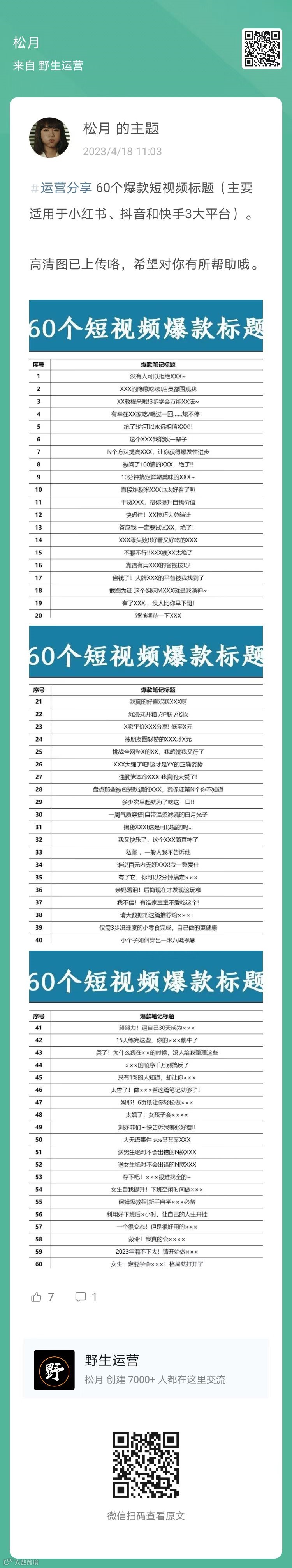 5、松月:60个爆款短视频标题(主要适用于小红书、抖音和快手3大平台)(扫码查看全文)