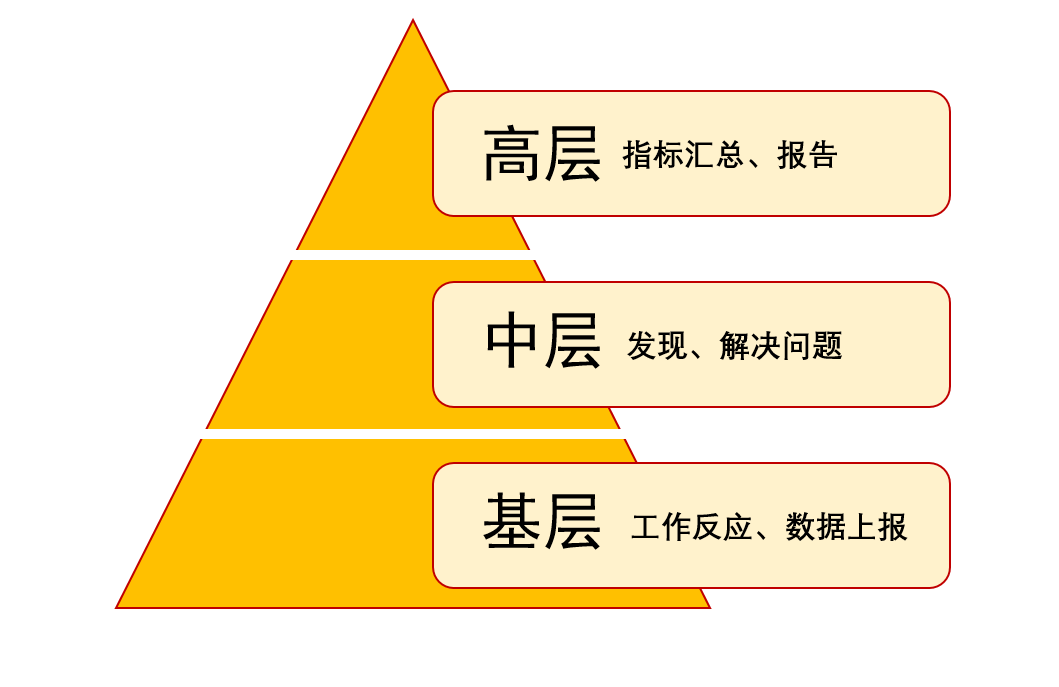 这是一张所有人都能够看懂的企业金字塔组织结构图,我们现在把企业报表和这张结构图对应起来,再结合当前你所认识的、了解的企业报表工作,你将不难发现,总是有一些企业,在报表分析当中,不分管理层级需求,将所有能够看到的数字以报表形式上报,没有体系,只有混乱。