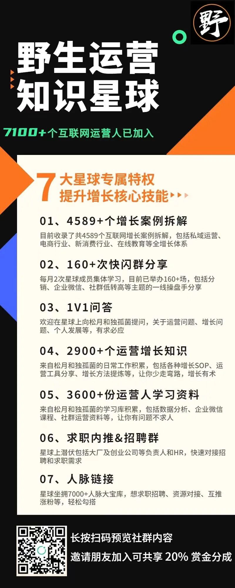 欢迎加入野生运营星球,每周一次快闪分享、运营人学习一手资料、1V1答疑……等硬核干货,而且还能一次入手包括 4589 个案例拆解全库、160+ 场群分享的音频+逐字稿、N多运营工具包和资料,就问你一句,值不值?