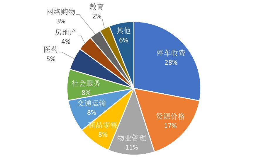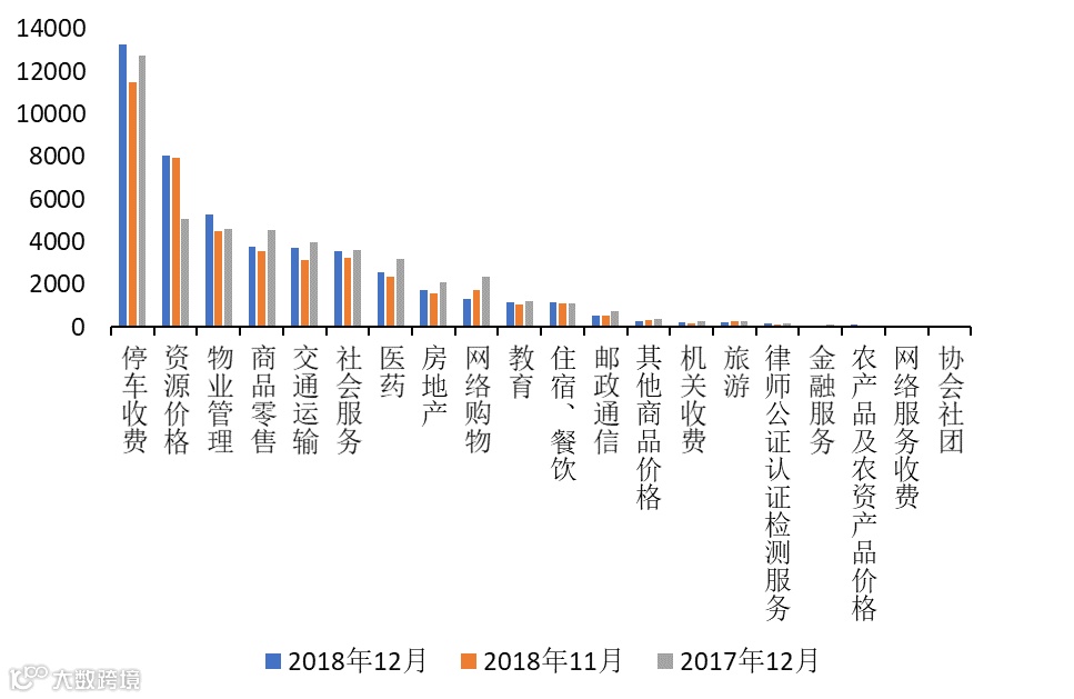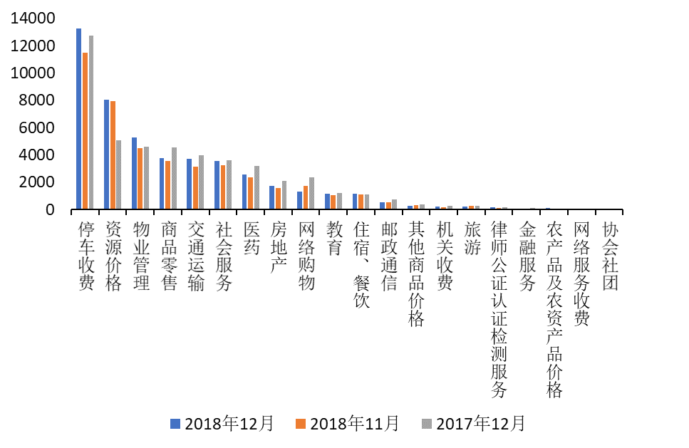 12月平台受理量排名前五的行业分别是停车收费(13252件)、资源价格(8086件)、物业管理(5311件)、商品零售(3780件)和交通运输(3728件)。从环比变化上来看,金融服务和协会社团上升,其他行业受理量平稳,从同比变化上看,资源价格、农产品及农资产品上升,其他行业受理量平稳。