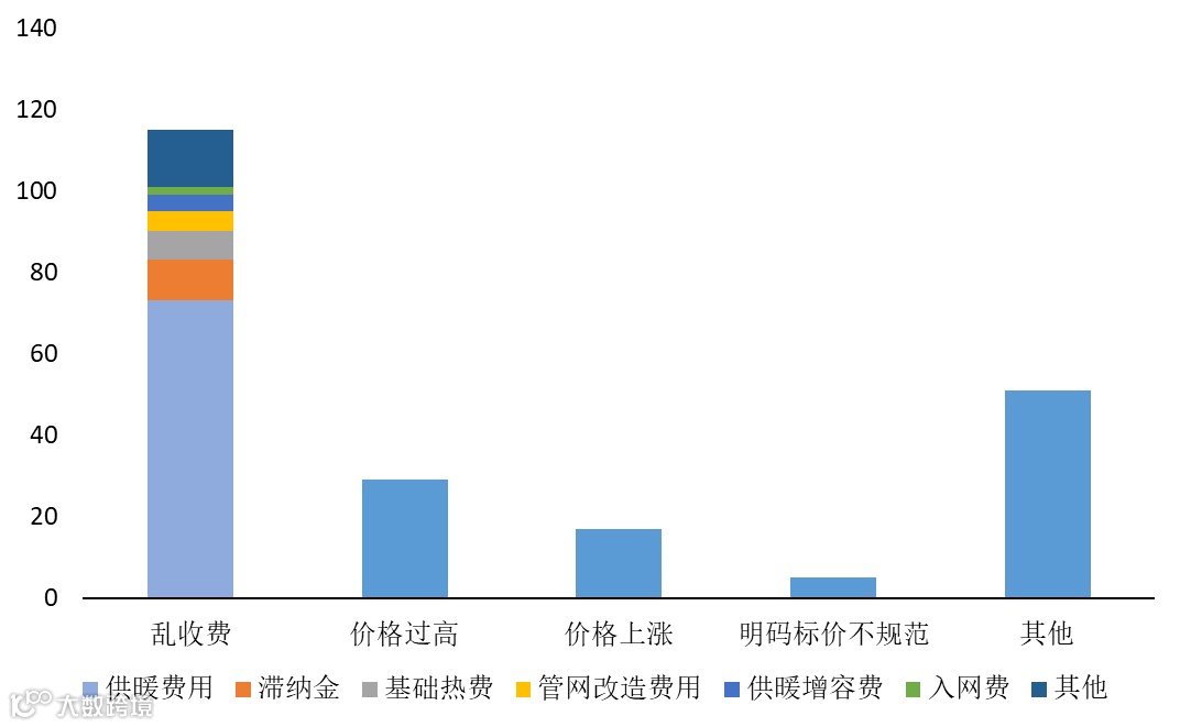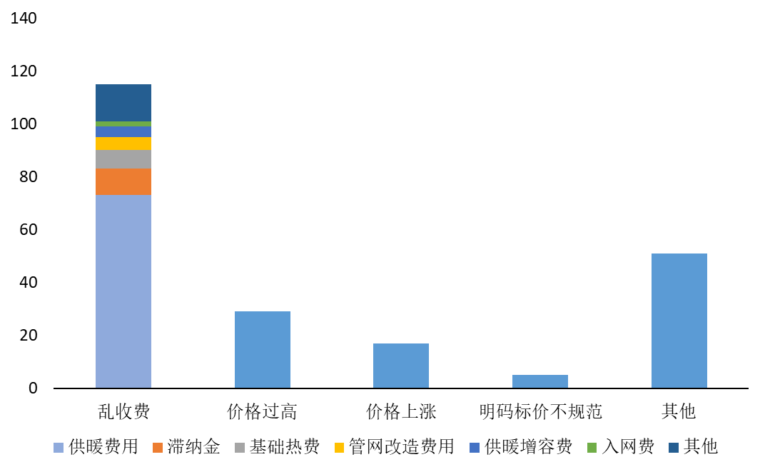 本月,我国多地气温骤降,迎来用暖、用气高峰,暖、气等资源价格成为民生关注热点之一。数据显示,供暖方面,本月平台共受理相关案件885件,同比下降14.9%,环比下降27.9%。其中,物业公司、供暖公司等违规或强制收取供暖费、管网改造费、滞纳金、基础热费等费用是民众反映最集中的问题,共计115件;其次,价格过高、价格上涨、明码标价不规范等问题也受到关注,分别有29、17和5件。