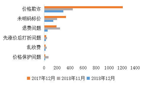 从消费者反映的主要问题来看,2018年12月主要涉及价格欺诈、未明码标价、退费问题、先涨价后打折等问题,同比、环比均有所下降。其中消费者反映最多的是价格欺诈,案件量为292件,同比减少75.75%,环比减少32.56%;涉及未明码标价案件量为137件,同比减少58.98%,环比减少29.02%;涉及退费问题案件量为52件,同比减少72.19%,环比减少78.33%;涉及先涨价后打折问题案件量为23件,同比减少20.69%,环比减少39.47%。