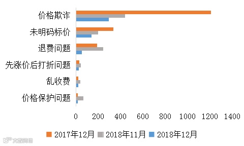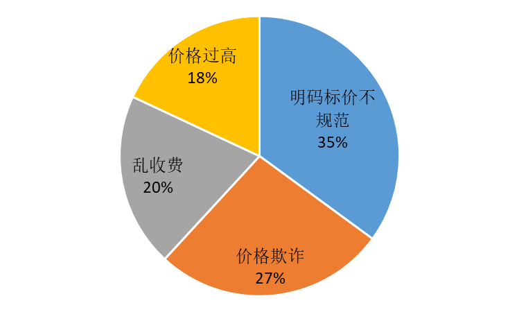 数据分析发现,明码标价不规范、价格欺诈(如:拒退预付款、押金等)价格过高、乱收费等是消费者反映最集中的几个问题,各占35%、27%、20%及18%。