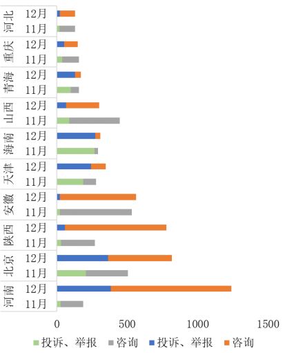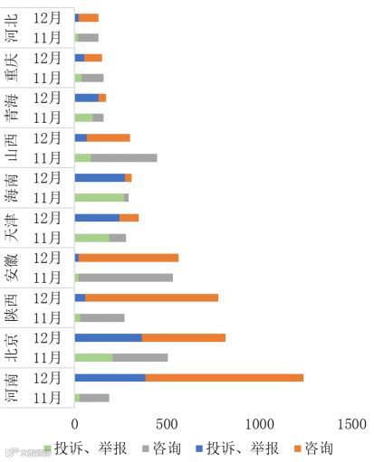 12月受理量排名前十的省份依次是北京(8071件)、浙江(5015件)、江苏(4226件)、陕西(4080件)、河南(3638件)、上海(2754件)、广东(2738件)、重庆(2487件)、安徽(2002件)、天津(1782件)。