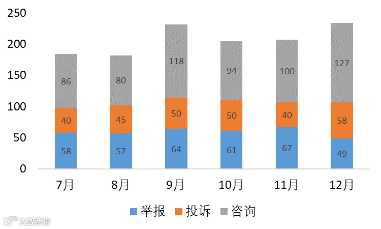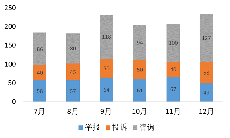 12月,全国12358价格监管平台受理价格举报、投诉、咨询共计57146件,环比上升8.6%,同比下降0.4%。其中,价格举报8632件,环比上升12.0%,同比上升8.7%;价格投诉5457件,环比上升4.1%,同比上升2.2%;价格咨询43057件,环比上升8.6%,同比下降2.4%。