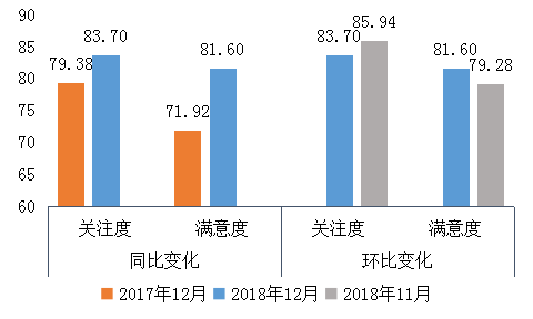 互联网舆情数据显示,2018年12月网购市场价格舆论关注度为83.70,较11月环比下降2.24,舆论满意度为81.60,较11月环比提升2.32。从同比来看,本月网购市场价格舆论关注度和满意度较2017年同期分别提升4.32、9.68。