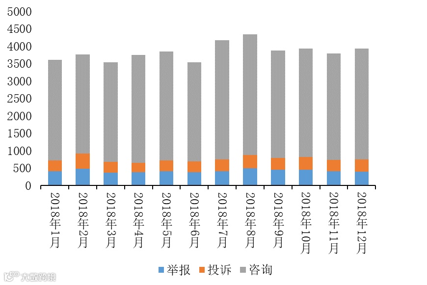 2018年12月,全国12358价格监管平台共受理网络购物类案件1351件,较2017年同比减少43.94%,较上月环比减少27.68%。其中,价格举报607件,较2017年同比减少53.88%,较上月环比减少35.22%;价格投诉136件,较2017年同比减少77.67%,较上月环比减少20.47%;价格咨询608件,较2017年同比增加25.36%,较上月环比减少20.00%。数据显示,网购类案件受理量自2017年7月起发生断崖式下跌,随后呈持续波动下降趋势。