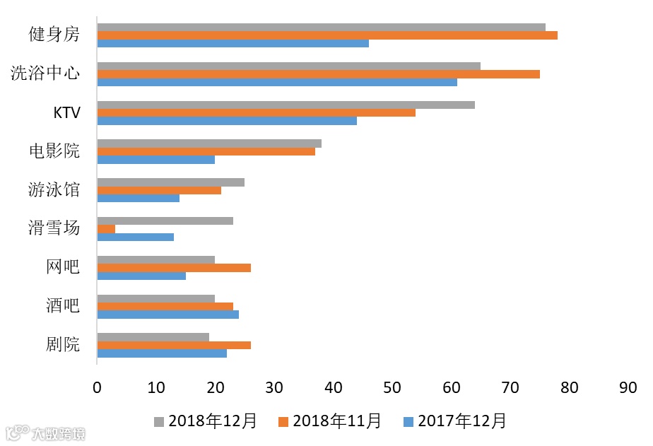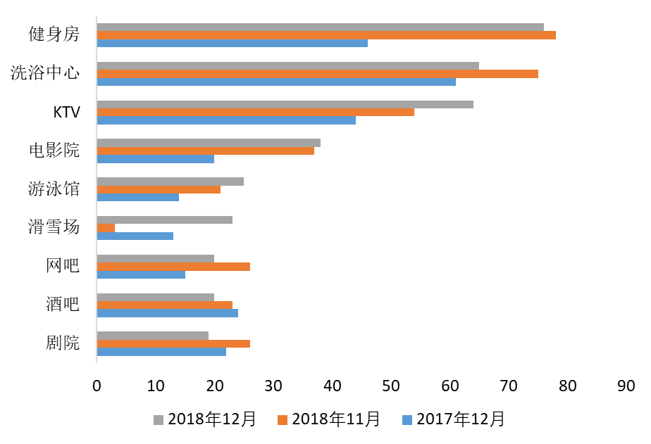 平台数据显示,健身房、洗浴中心、KTV是消费者反映价格问题最集中的三大娱乐场所,本月,相关案件分别为76、65、64件。此外,电影院、游泳馆、剧院、酒吧、网吧、滑雪场等消费集中的娱乐场所价格问题也受到关注。从同比变化上看,发生在健身房、电影院、游泳馆等场所的相关案件量有所上升,KTV、洗浴中心、酒吧等场所的相关案件量有所下降;从环比变化上看,除滑雪场外,发生在其他场所的案件数均有所下降。