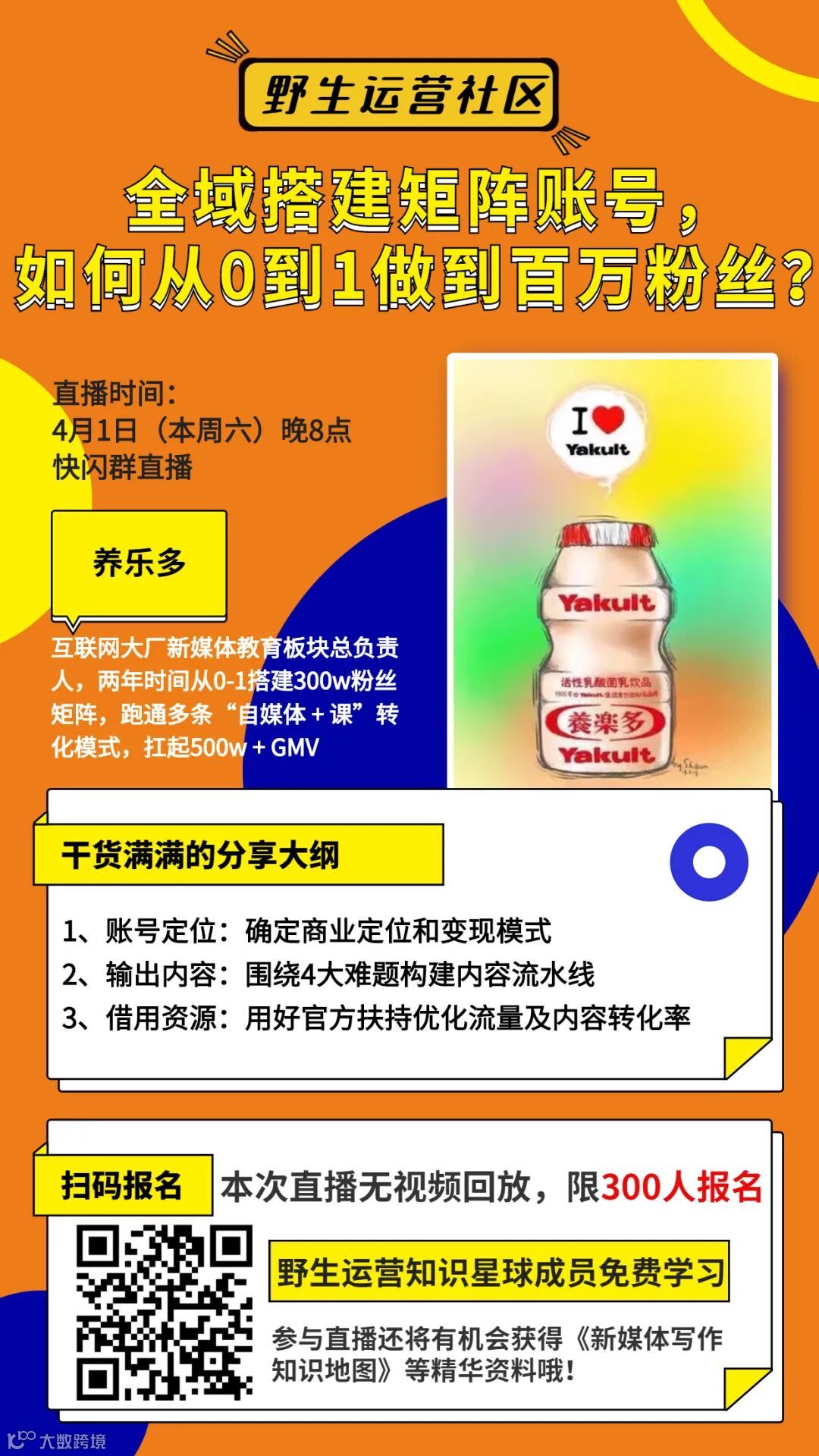 插入一条:本周六晚8点,我邀请到养乐多,互联网大厂新媒体教育板块总负责人,两年时间从0-1搭建300w粉丝矩阵,带来分享《全域搭建矩阵账号,如何从0到1做到百万粉丝》。