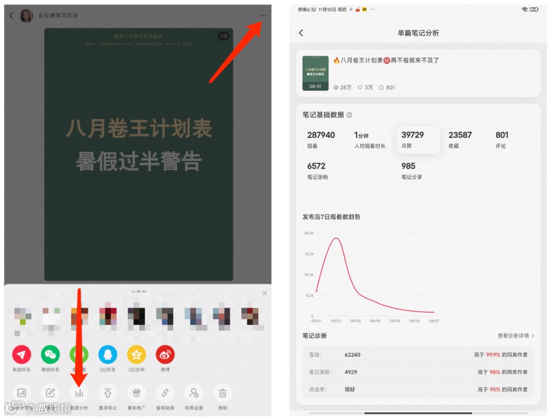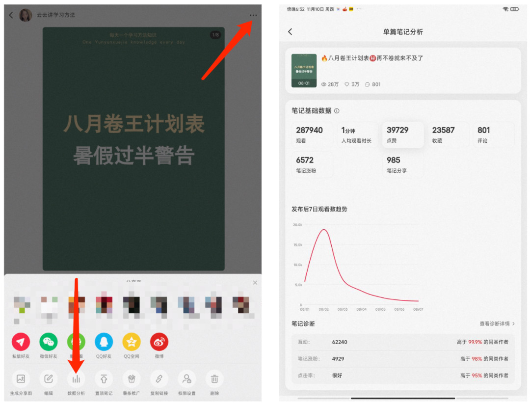 点开你的笔记,选择右上角三个点,选择数据分析,便可来到该笔记的数据后台。
