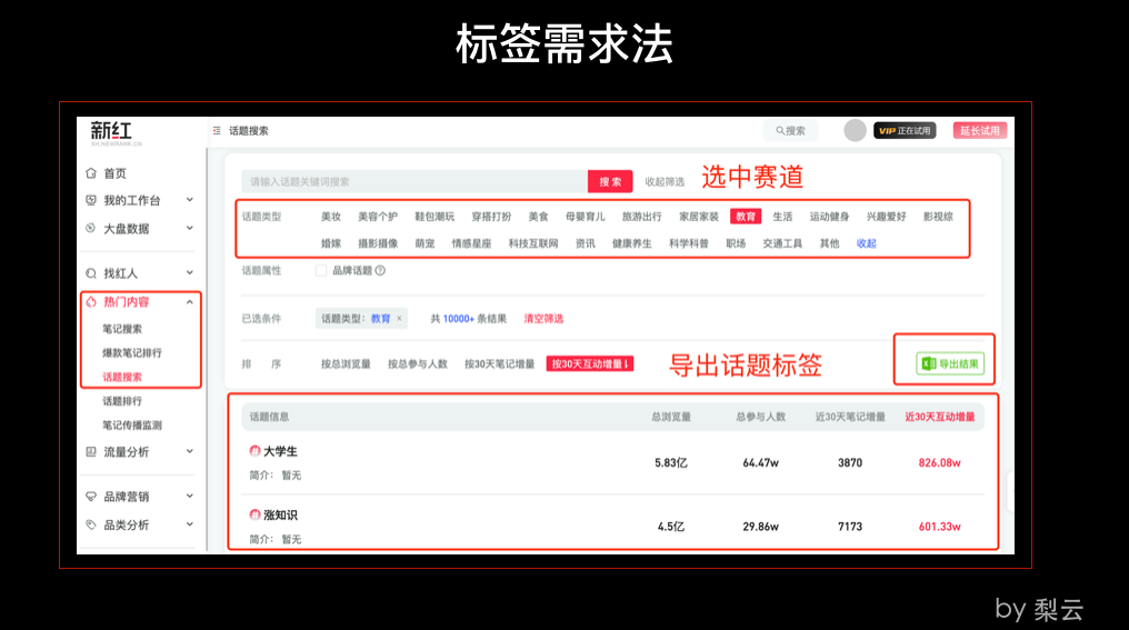 在新红数据找到话题类型,其实就是赛道分类,选中后导出其结果。