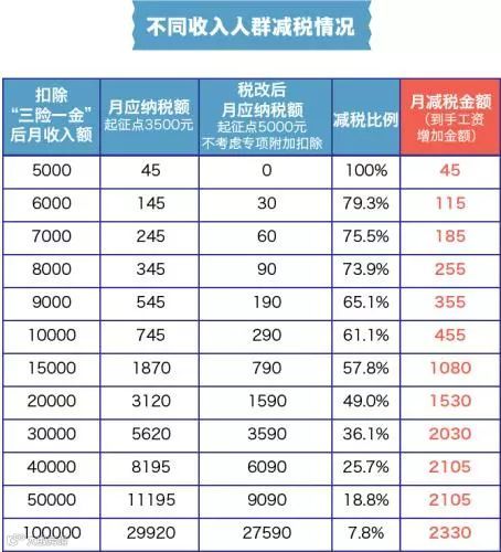 【影响】起征点提高后,工薪阶层普遍受益。国家税务总局数据显示,改革实施首月,全国个人所得税减税316亿元,有6000多万税改前的纳税人不再缴纳工资薪金所得个人所得税。