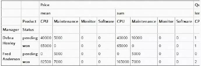 table = pd.pivot_table(df,index=["Manager","Status"],columns=["Product"],values=["Quantity","Price"],