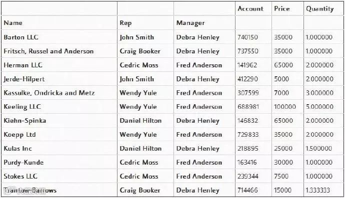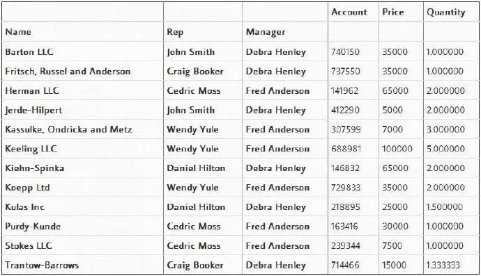 可以看到,透视表比较智能,它已经开始通过将“Rep”列和“Manager”列进行对应分组,来实现数据聚合和总结。那么现在,就让我们共同看一下数据透视表可以为我们做些什么吧。