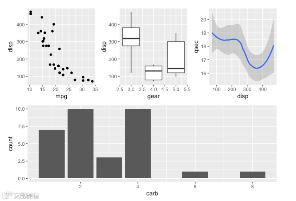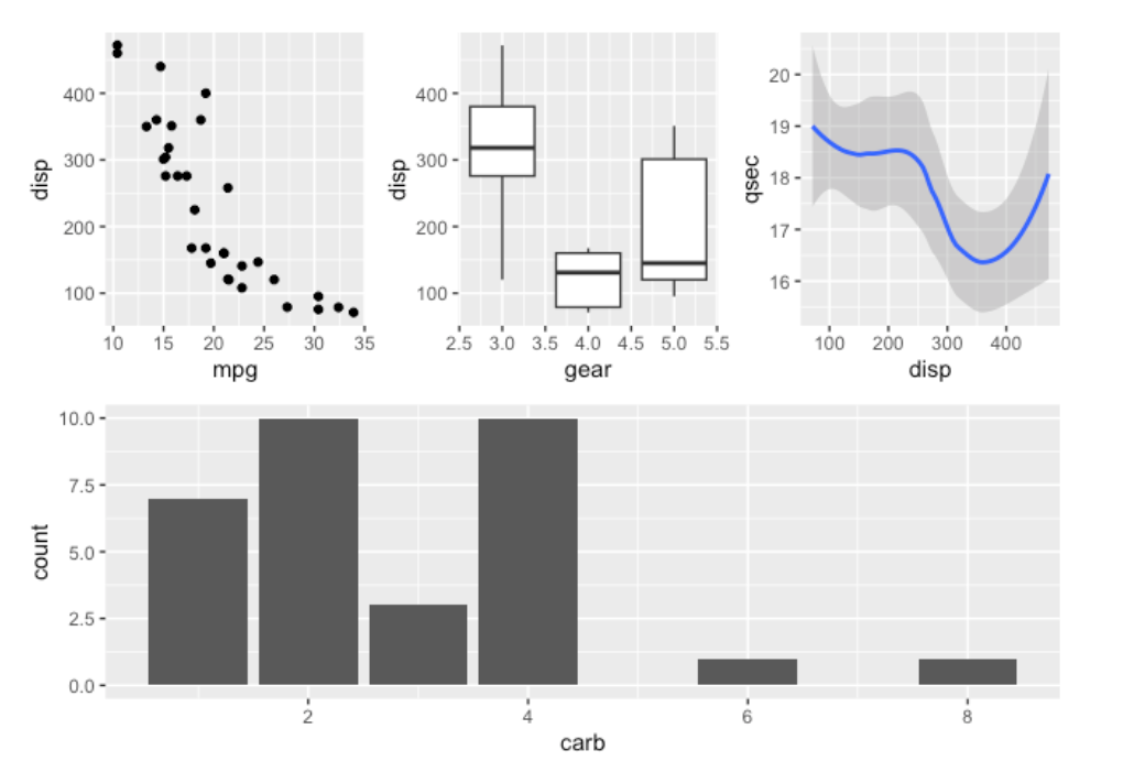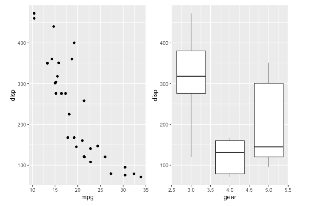 p2 <- ggplot(mtcars) + geom_boxplot(aes(gear, disp, group = gear))