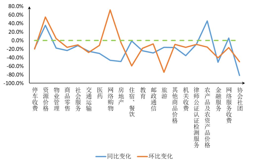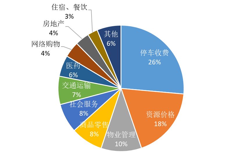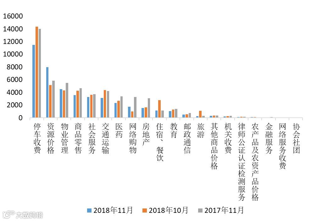 (三)热点行业分布。11月平台受理量排名前五的行业分别是停车收费(11478件)、资源价格(7959件)、物业管理(4521件)、商品零售(3574件)和社会服务(3264件)。从环比变化上看,资源价格、网络购物等行业受理量有所上涨,旅游、住宿餐饮等行业受理量下降明显;从同比变化上看,资源价格、农产品及农资产品价格等行业受理量有所上涨,房地产、网络购物等行业受理量下降明显。