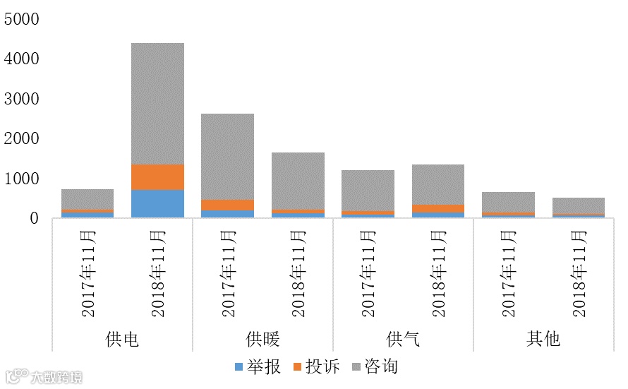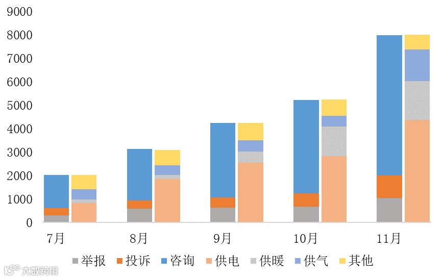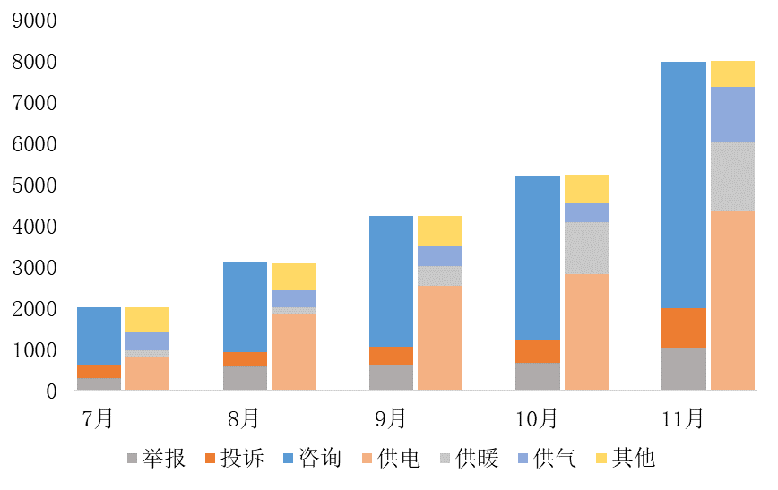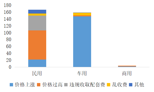 具体来看,供暖价格相关案件受理量为1647件,同比下降36.99%,环比增长30.40%;电力价格相关案件总受理量4380件,同比增长507.49%(投诉举报主要关注的问题为用电价格过高、未执行降价政策、乱收费、转供电加价等),环比增长54.44%;天然气价格相关案件总受理量1347件,同比上涨11.78%,环比增长295.49%。与去年同期相比,供暖价格相关案件受理量下降,电、气价格问题更受关注。
