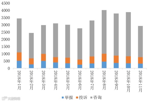 2018年11月,全国12358价格监管平台受理各类价格举报、投诉、咨询共计52608件。本月,首届中国国际进口博览会在上海成功举行,“进博会”期间上海地区市场价格秩序良好;“双十一”期间网购类案件受理量逐年下降,网购及快递行业价格秩序良好;供暖价格相关案件受理量同比下降,电、气价格问题受到关注。