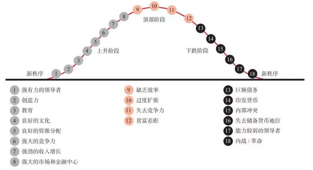 大周期发生的2条普适因素:大周期变动的征兆,一种是财富和权力斗争(即革命和战争形式的冲突,通常是货币和信贷崩溃与巨大贫富差距所致),另一种是严重天灾(如干旱、洪水和大流行病),无论哪一种,当国家本身抵抗弱,引发了革命和战争,进而改变了国内和世界秩序。