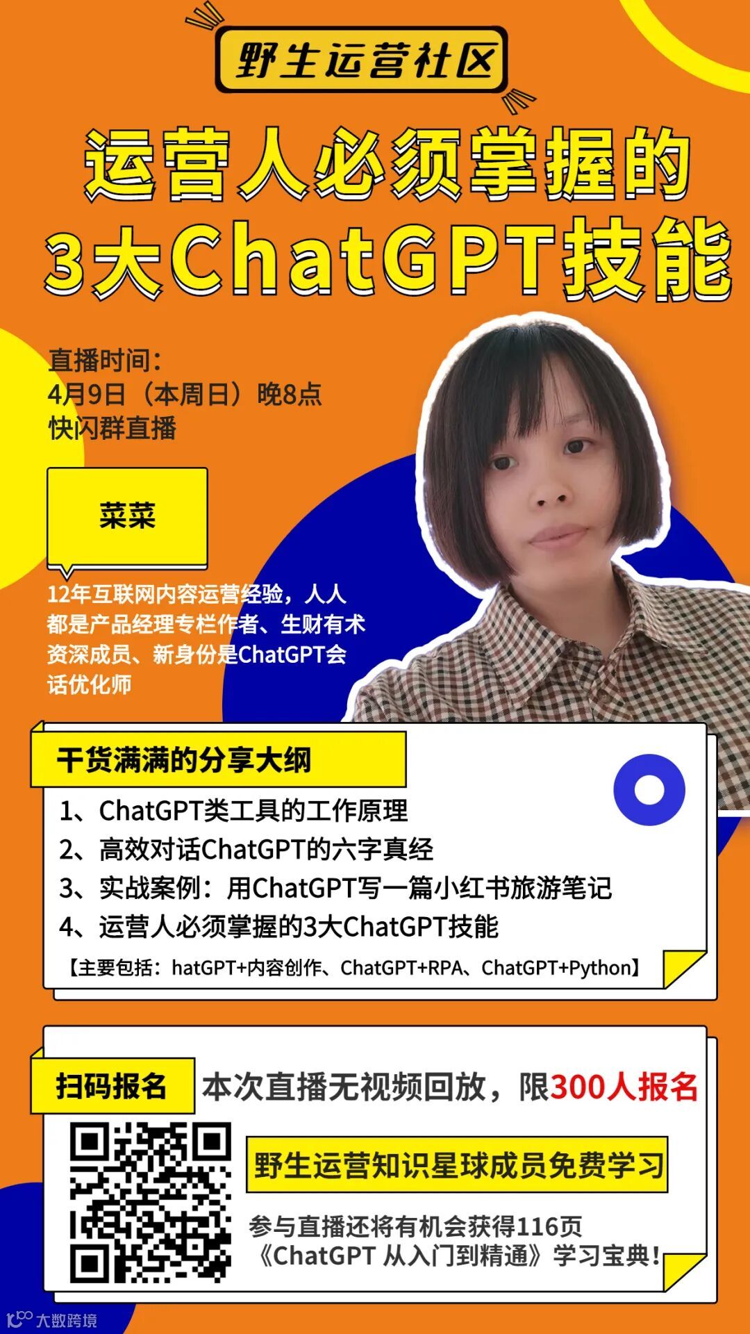 本周日晚8点,我邀请到菜菜,12年互联网内容运营经验,ChatGPT会话优化师,带来分享《运营人必须掌握的3大ChatGPT技能》。