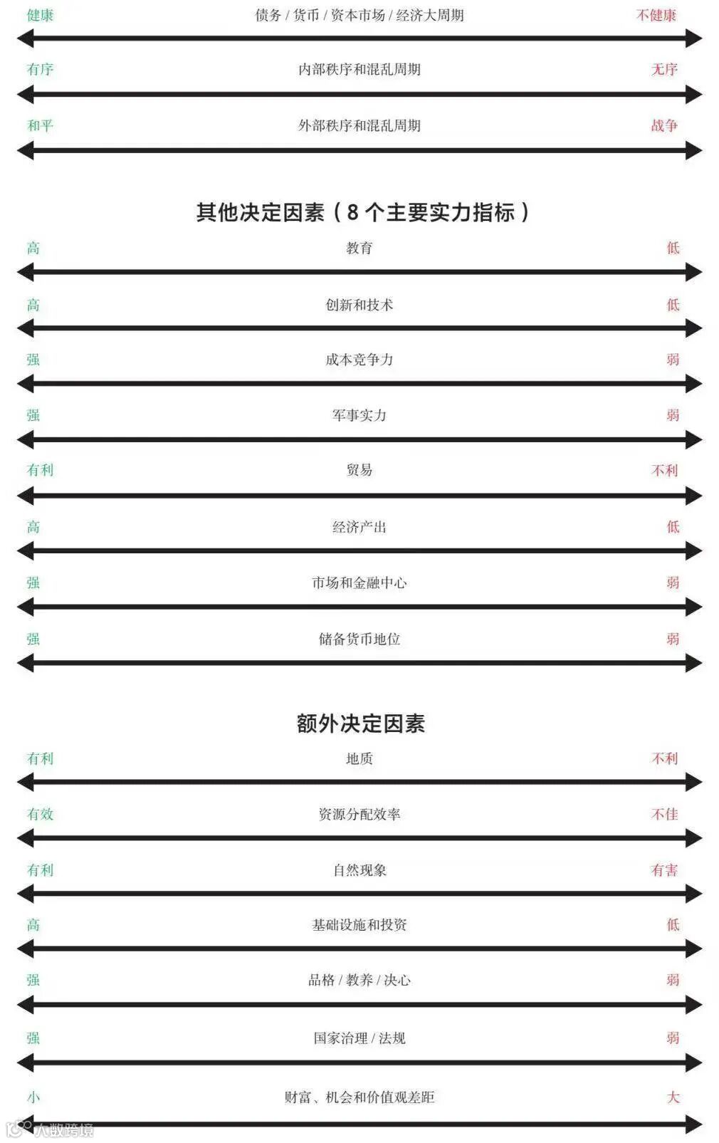 (1)教育,(2)竞争力,(3)创新和技术,(4)经济产出,(5)世界贸易份额,(6)军事实力,(7)金融中心实力,(8)储备货币地位。