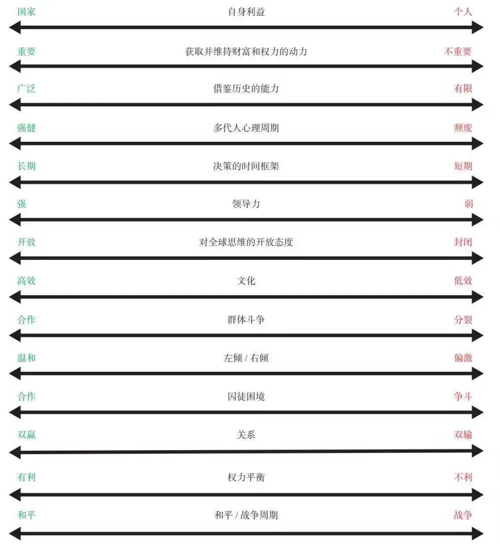 人性决定因素:②自身利益 ③获得并维持财富和权力的动力 ④资本市场 ⑤借鉴历史的能力 ⑥多代人心理周期