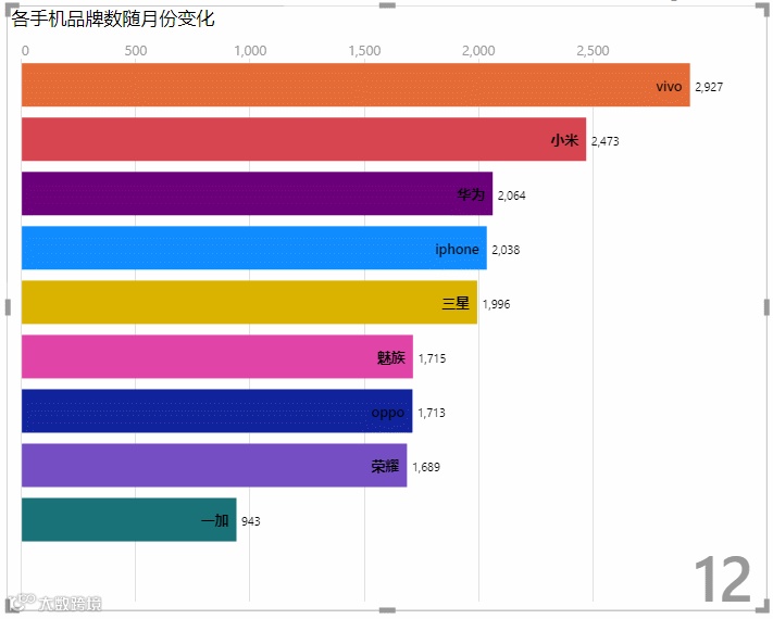 还有Animated Bar Chart Race可以动态演示数据达成,这里动态演示不同月份手机品牌数的动态变化,PowerBI软件所有的视觉对象都是内置的,使用起来轻松、方便。