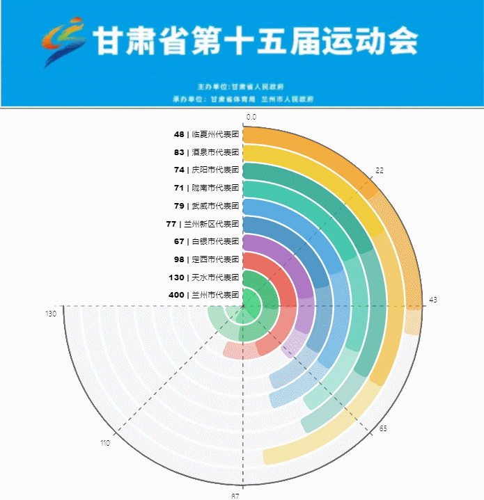 此外,PowerBI中内置了很多视觉对象,比如这里使用RadialBarChart径向条形图用来展示分类字段的数据达成情况,展示各个市的体育代表团奖牌数据情况。