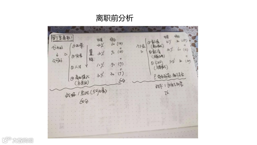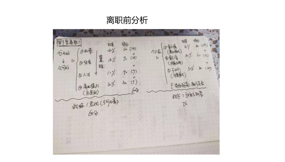 我现在回想起我3年前的决定,依然觉得无比正确,前段时间我翻到当时决定离职前的一张笔记,这两天也和几位朋友做分享,他们当场都惊呆了,离职前居然能这么理性分析一通,这就是我们今天要讲的“4看3圈分析框架”: