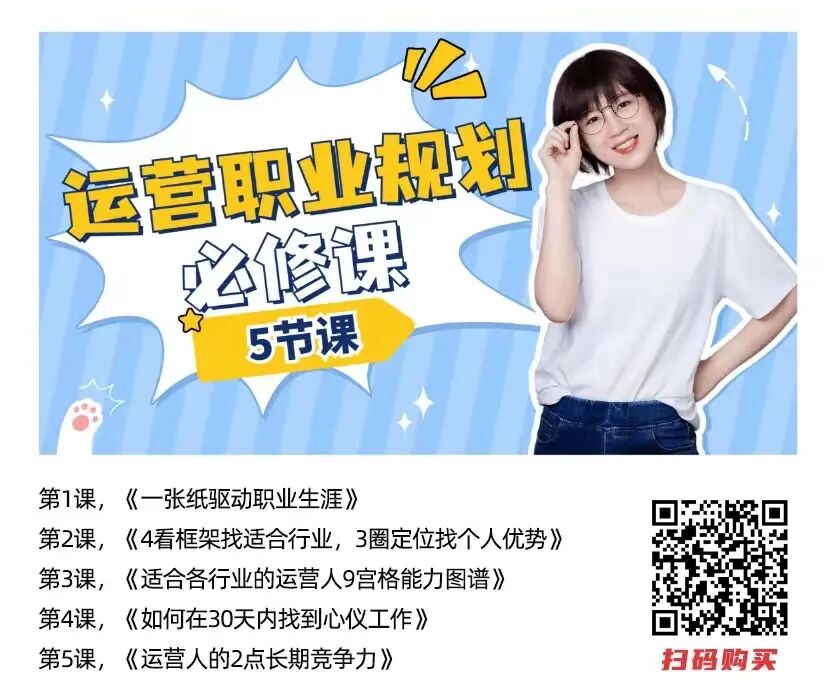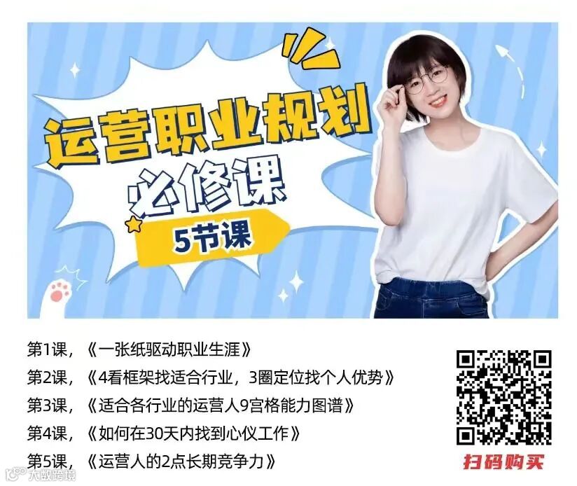 以上,本篇内容来自松月课程产品《运营职业规划必修课》部分节选内容,如果你想系统解决运营人在职场规划问题,建议入手,而不是简单的头疼医头,脚疼医脚。