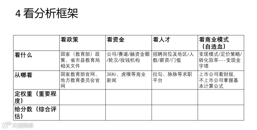 下面来看看这个“4看分析框架”的构成,我会用教育行业举例,如何用“4看框架”分析某教育行业公司。