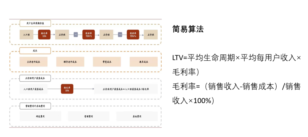 用户生命周期价值、运维成本合计、正价班获客成本、营销外其他费用