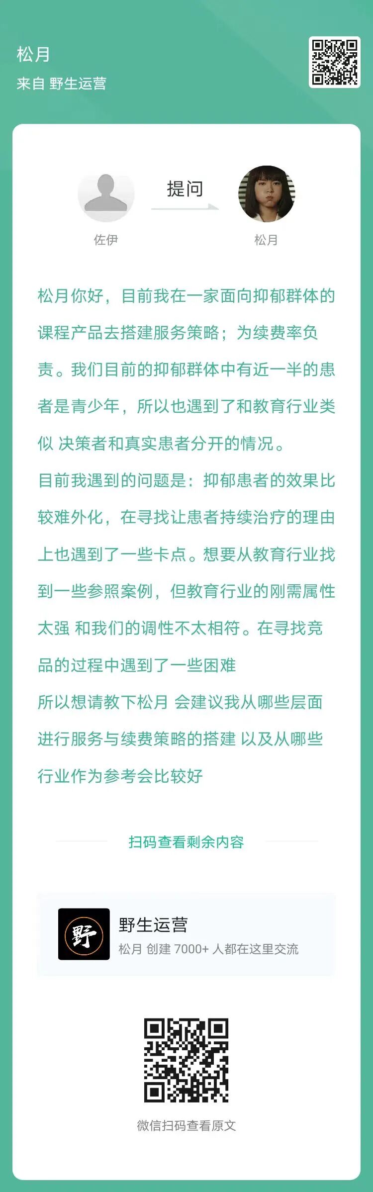 1、提问:我在一家面向抑郁群体的课程产品去搭建服务策略,会建议我从哪些层面进行服务与续费策略的搭建,以及从哪些行业作为参考会比较好?(扫码查看全文)