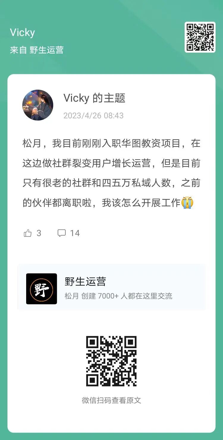 3、提问:刚入职新公司负责社群裂变用户增长运营,但是目前只有很老的社群和四五万私域人数,之前的伙伴都离职了,我该怎么开展工作?(扫码查看全文)