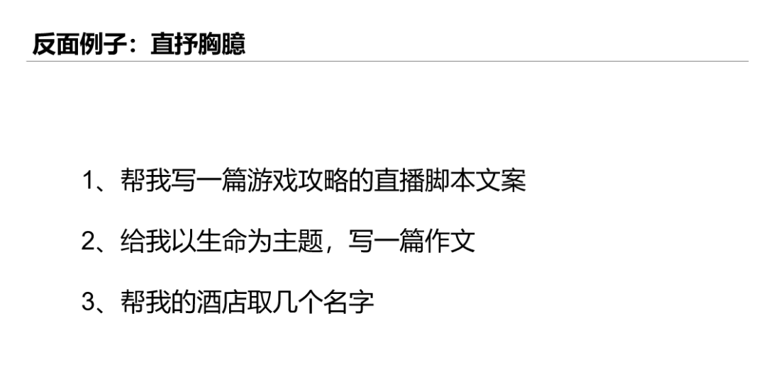 好,接下来讲我们今天的重点部分,高效对话的ChatGPT的六字真经。有很多小伙伴在和ChatGPT对话时,发现它生产的内容并不能达到我们的期望,来来回回都是在讲一些车轱辘话,这是为什么呢?其实是你问问题的方式不对。这里给到几个反面案例: