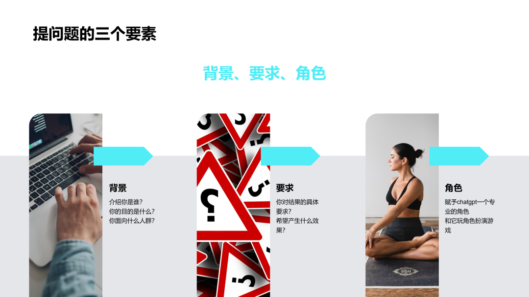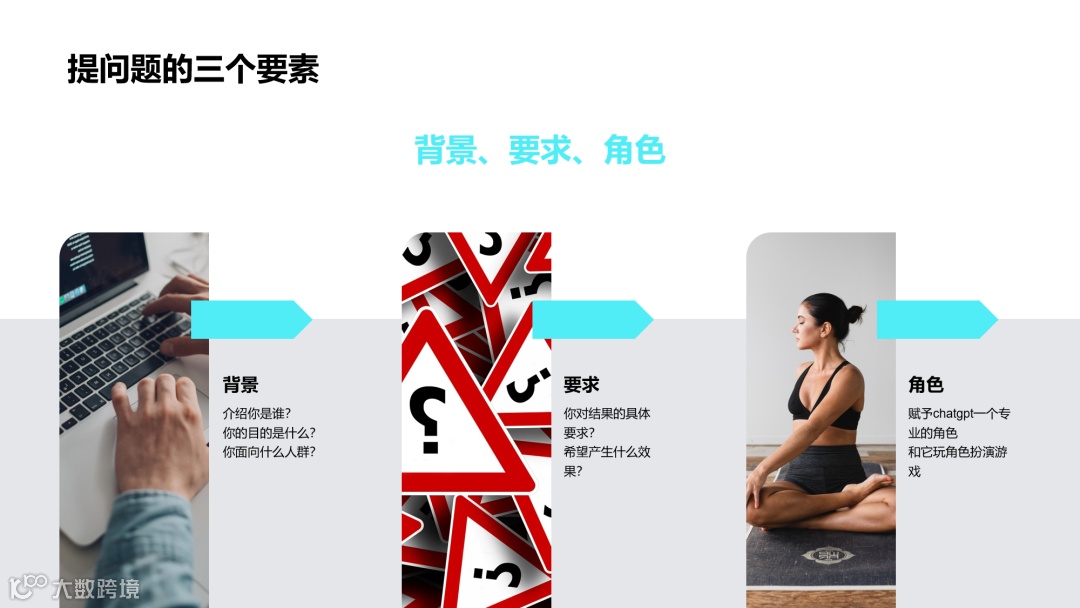 我们日常和别人对话的时候,常常喜欢直抒胸臆,但是和ChatGPT对话不能那样,因为它并不了解,你问题背后的信息,你是谁,你为什么要问这个问题,你期望达到什么目的等等。怎样去提升对话的效率和质量呢?我通过前段时间的训练经验,再结合我的内容营销、用户洞察和采访经验,我提出了高效对话的六字真经:背景、要求,角色。