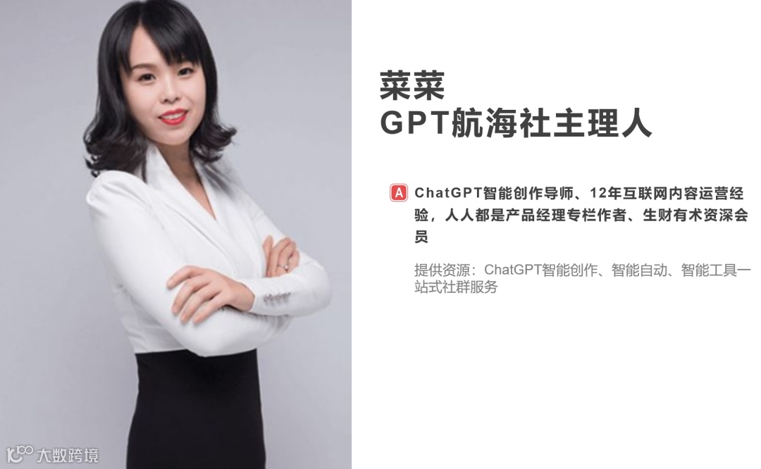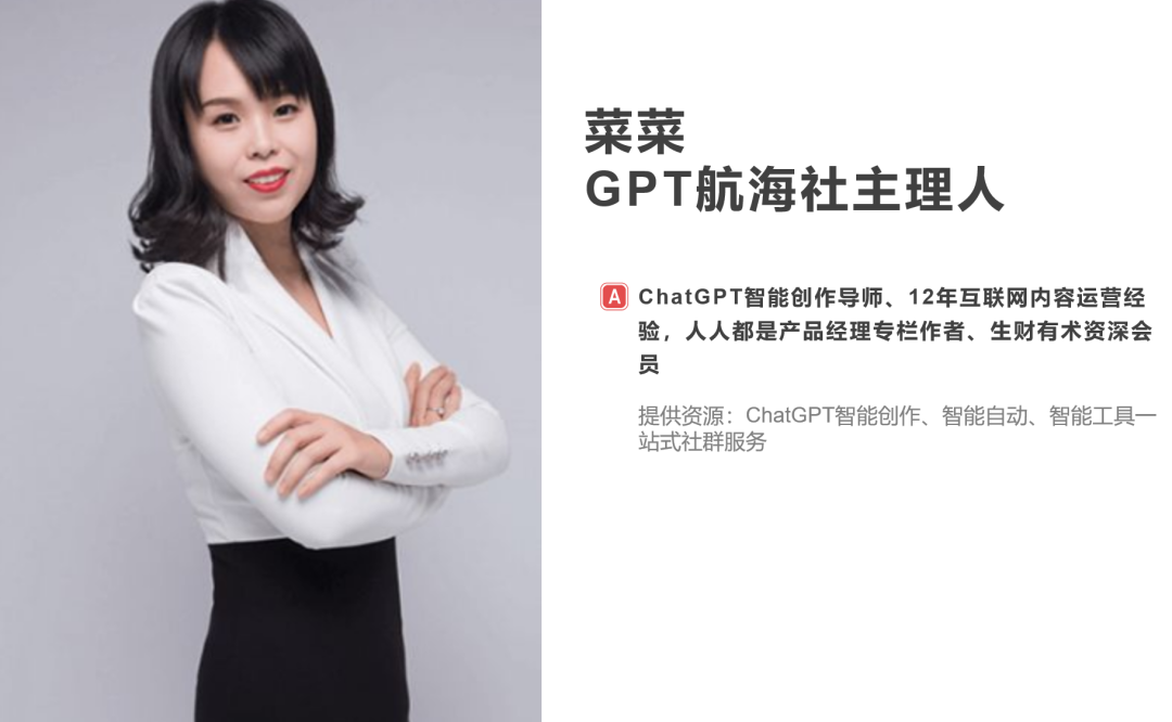 先来做个自我介绍,我是GPT航海社的主理人,有12年的互联网内容运营经验,目前是“人人都是产品经理的专栏作者”。我目前利用业余时间,在做ChatGPT的项目,我还联合和两位生财有术的大佬、两位在RPA和Python领域颇有建树的IP,一起给大家提供ChatGPT智能创作、智能自动、智能工具的一体化解决方案,这也是目前ChatGPT落地实战中比较全面的一个解决方案。