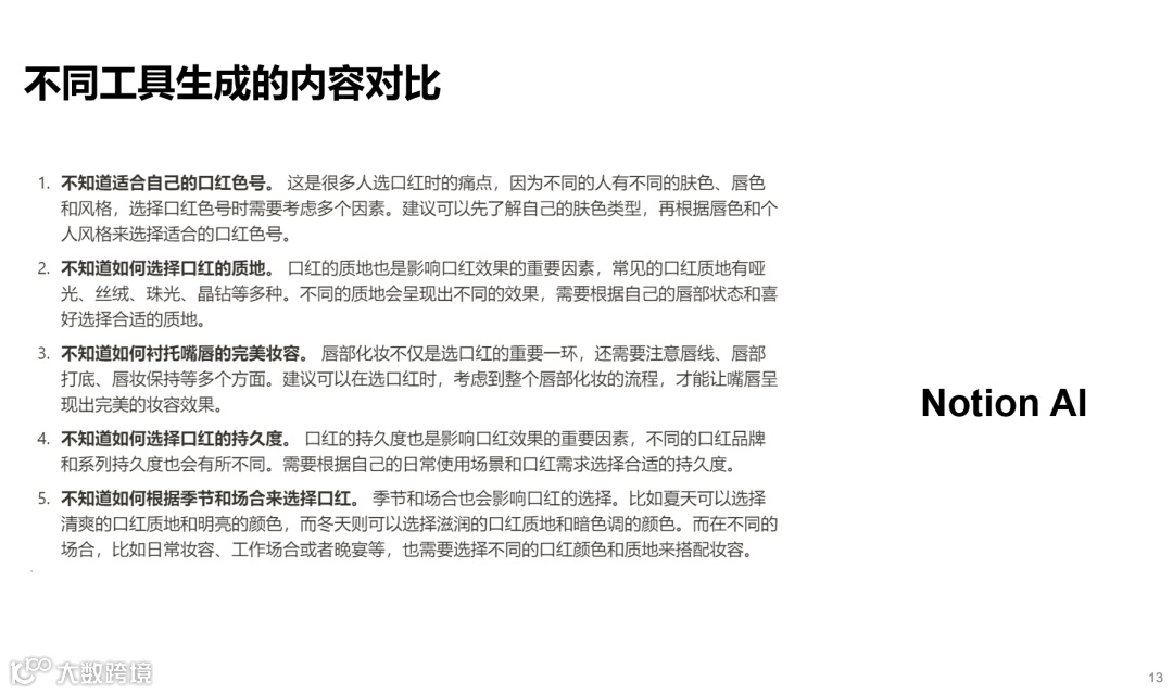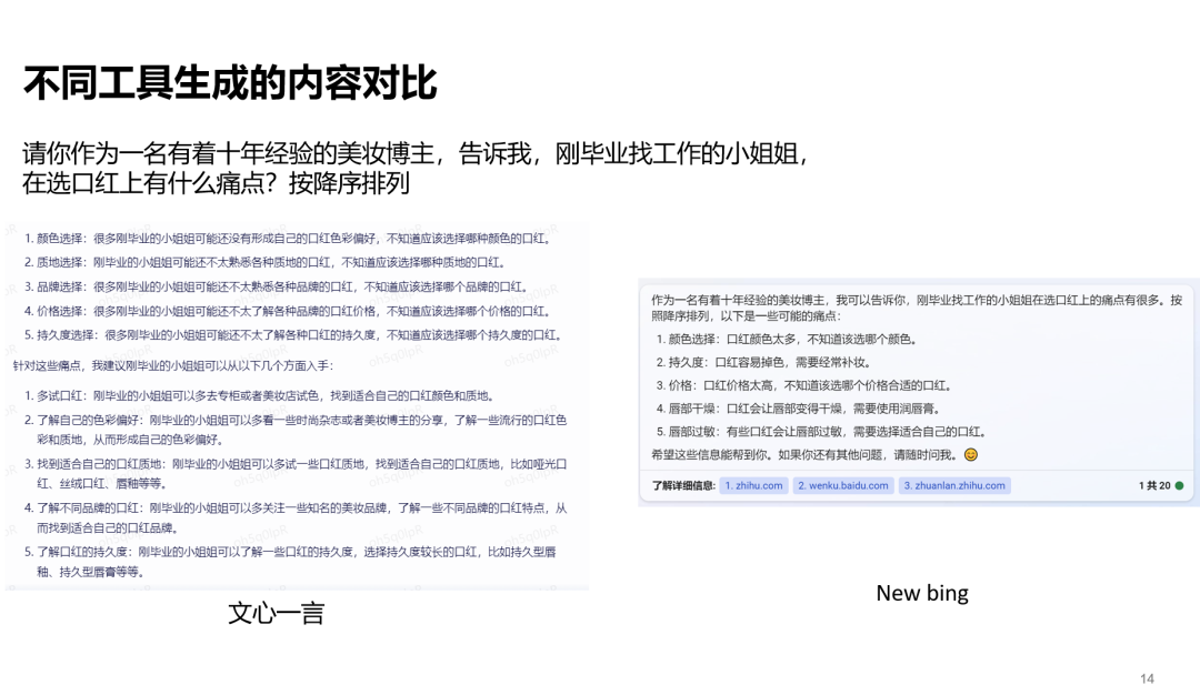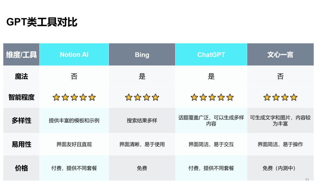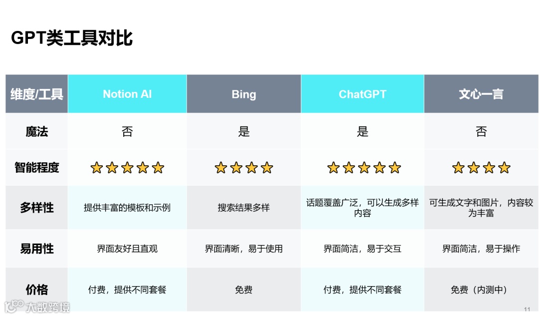 这是第一点,第二点,我们不要在ChatGPT这一棵树上吊死,穷则思变,两条腿走路。什么意思?除了ChatGPT这样的工具之外,其实还有很多类似的工具,它的使用门槛会低一些,比如Notion AI、Bing以及文心一言,还有open ai前员工做的Claude、阿里的GPT工具已经开放内测,华为的盘古大模型也马上要上线,大家不要愁没有工具用。我这里给大家对比了,不需要用魔法的就是notion AI和文心一言。