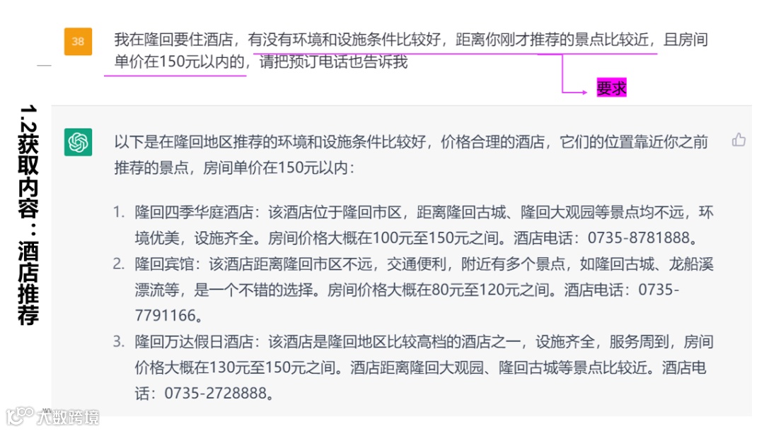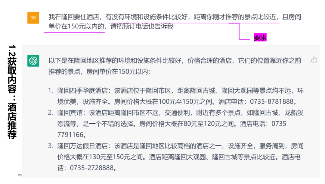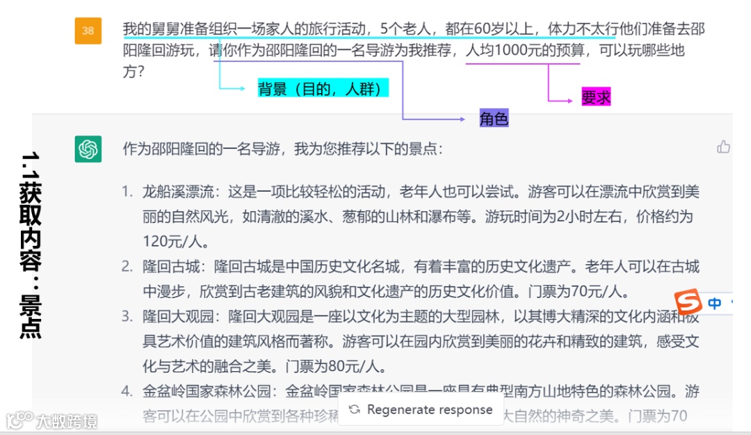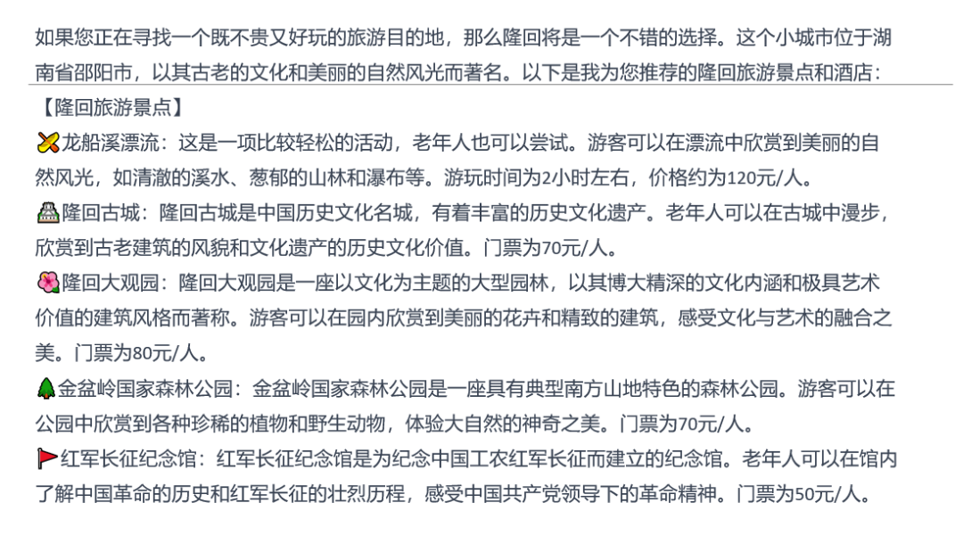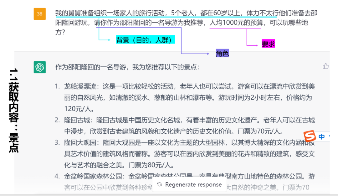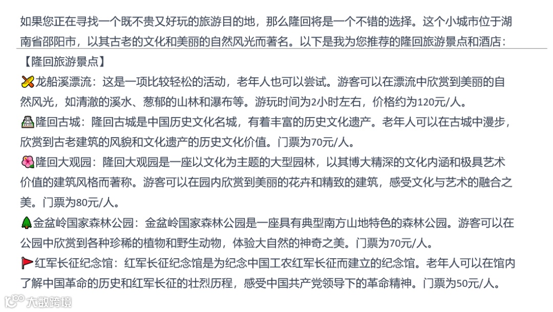 我的提问是包含了背景,角色和要求的,我的舅舅准备组织一场家人的旅行活动,五个老人都在60岁以上,这里就是我的背景;角色:我让ChatGPT扮演邵阳隆回当地的导游,我的要求是人均只有1000元的预算。我们可以看到ChatGPT给我生成的内容。因为版面的关系,我没有截全,其实后面还有很多。通过同样的方式,我把酒店的内容、美食的内容也获取了,由于版面的关系,我没有把美食内容放上来。