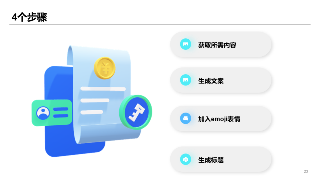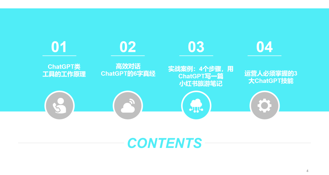 我建议所有的运营人首先要掌握的技能是智能的内容创作。内容创作其实也是运营人必备的一个基础技能。无论你是做社群运营还是产品运营、用户运营,你都是在和人对话,你都是要输出内容的。你写的一段社群话术、或者是产品手册,都必须让用户看得懂、戳中他们的痛点,给到利益点,才能让用户马上行动起来。而内容营销就是在干这个事。通过内容创作,我们能锻炼如何高效和ChatGPT对话的技巧,这也是入门的必备技能。对于专门做内容生产的小伙伴来说,可以用它来做竞品分析,市场调查,来确定你的内容定位,包括短视频,小红书,知乎内容以及文章插图的制作。后续你还可以打造自己的IP,用它来做课程。即便以上你都不需要,你总是要做方案汇报的对吧,这也是内容创作之一,你有了ChatGPT,能大大提升效率。
