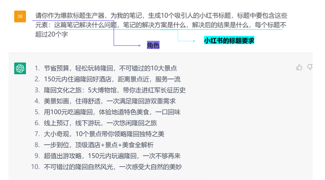 最后,我让ChatGPT帮我生成标题,这里我给它的角色是爆款标题生成器,要求是标题当中要包含解决什么问题、笔记的解决方案是什么、解决后的结果是什么,以及标题的字数: