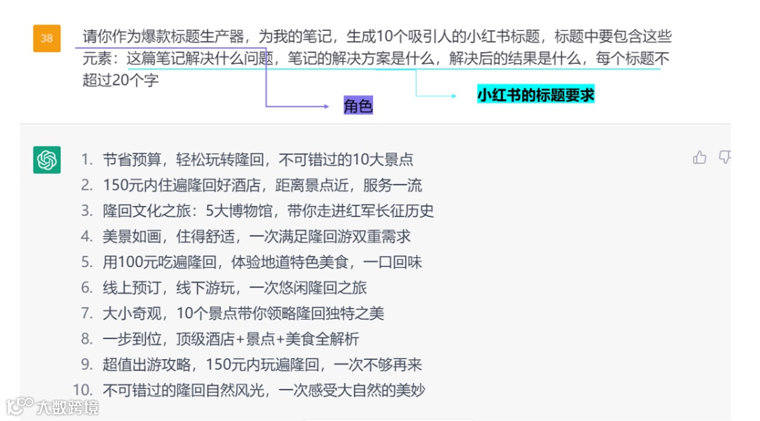 可以看到,生成的标题。还是挺不错的,至少能打80分的水平。这样的水平,我们在外面可能要花4000~5000去请一个文案,但是有了ChatGPT,这些钱都省下来了。